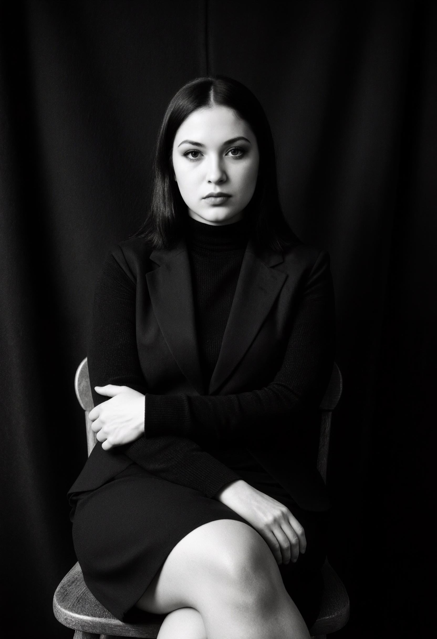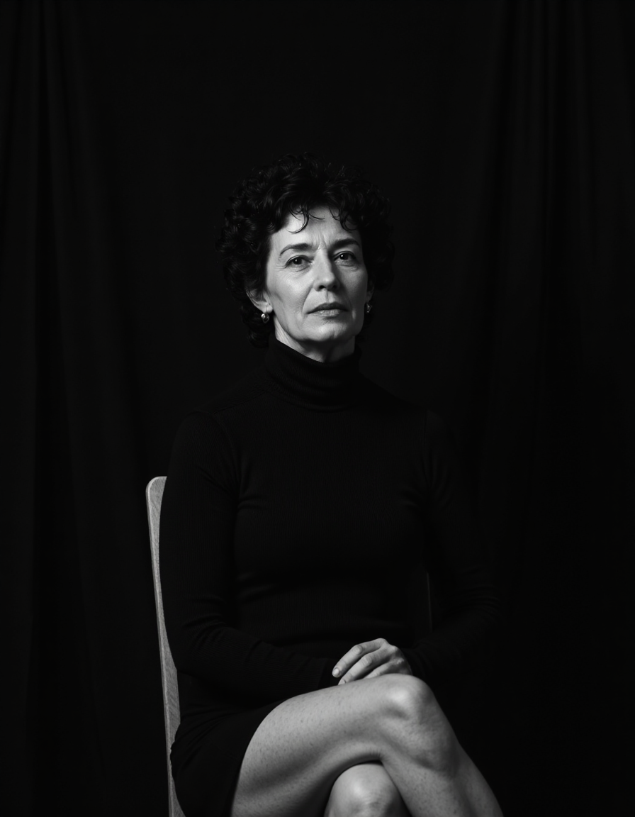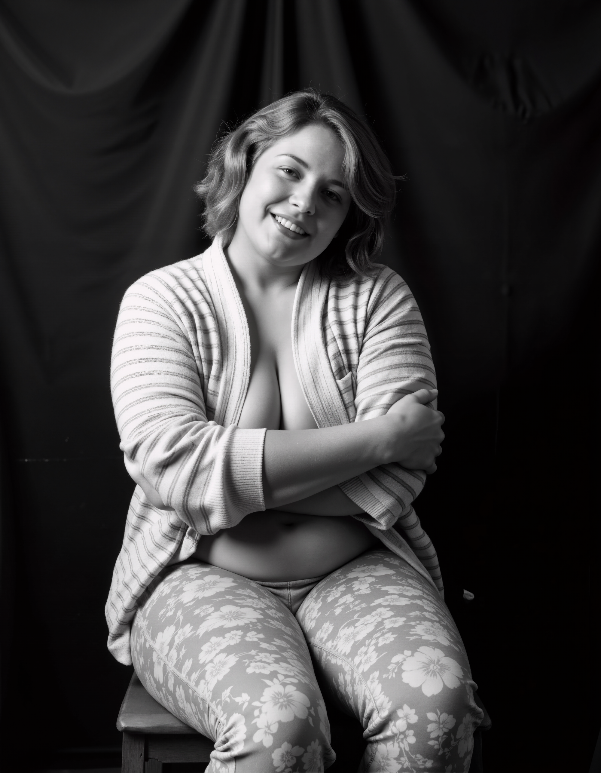 Everyday life women. Nudity, sometimes. Femininity, always. Classic black and white AI generated photography. Concept : a woman chooses to show herself the way she likes, black generic background and a wooden chair.