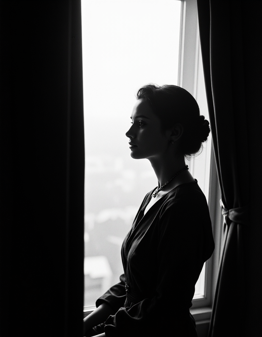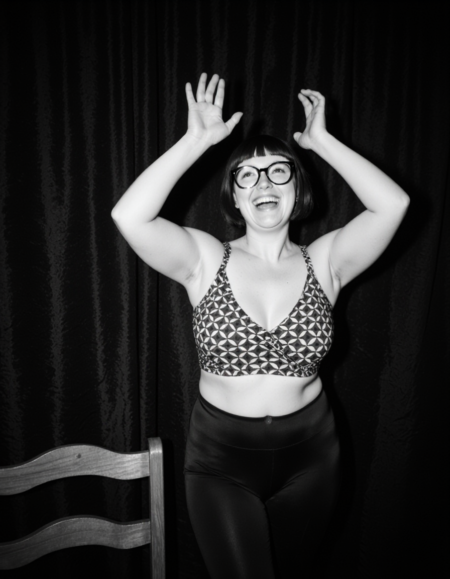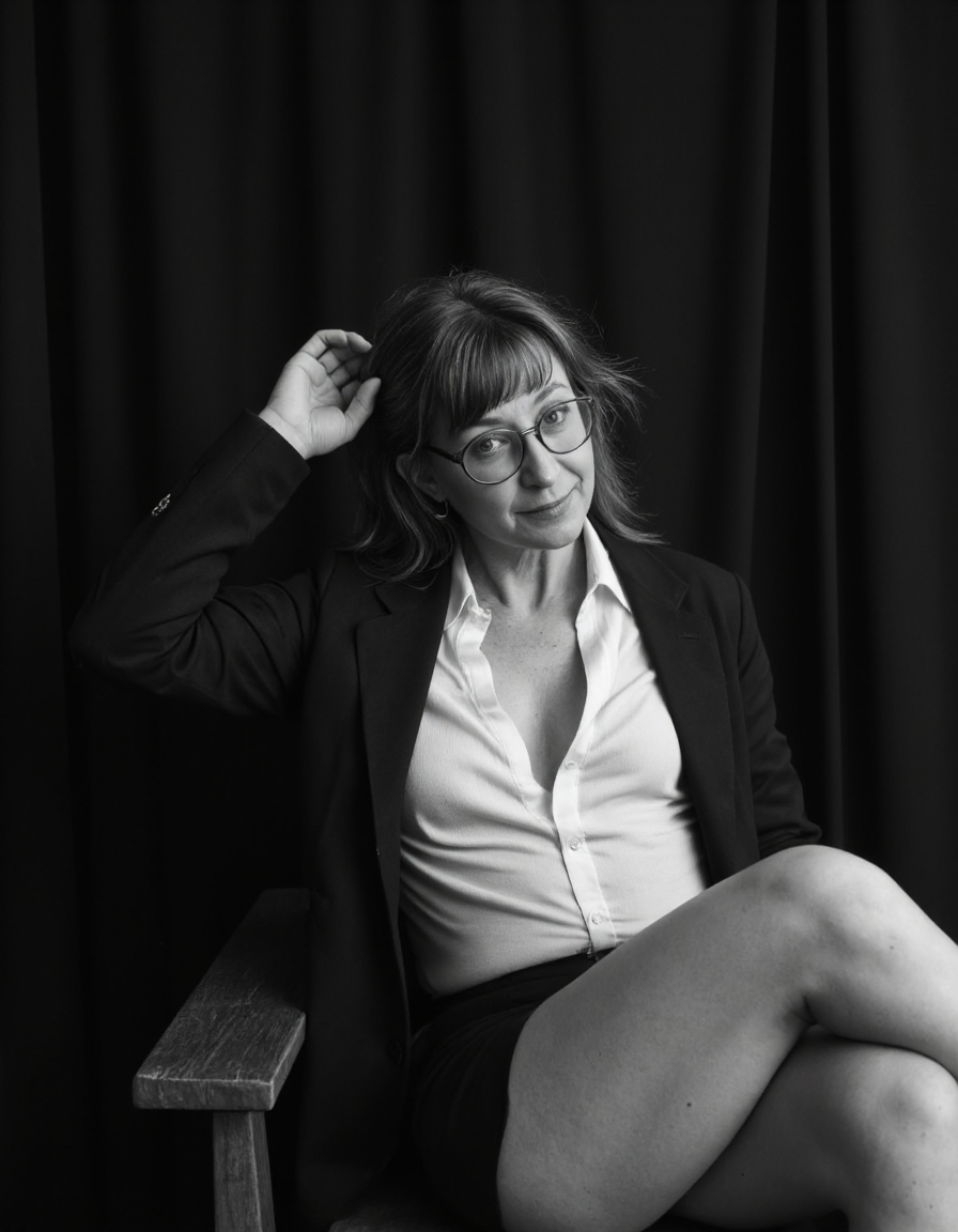 Everyday life women. Nudity, sometimes. Femininity, always. Classic black and white AI generated photography. Concept : a woman chooses to show herself the way she likes, black generic background and a wooden chair.
